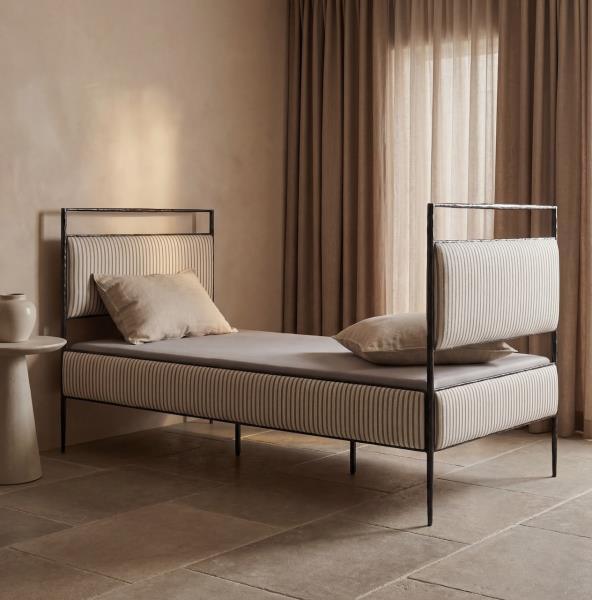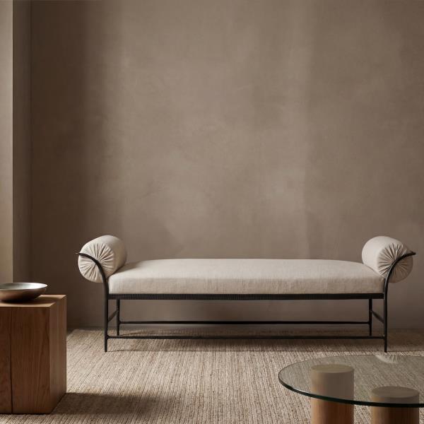 Ideal at the end of a bed, in an entryway, or as extra living room seating, the Vale Hammered Bench is handcrafted from hammered iron with lightly tapered stretchers and refined arm details. Two fixed bolster pillows with 100% GOLS-certified latex offer lasting support and comfort, making this versatile piece equally suited as a petite daybed.