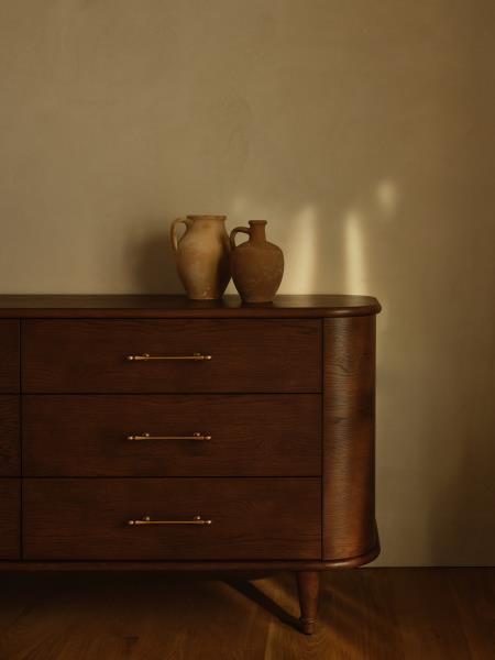 Crafted from oak with a warm walnut stain, this elegant display cabinet highlights the wood’s natural grain and timeless character. Glass-paneled double doors with soft, rounded corners frame shelves for showcasing objects, books, or dinnerware, while two lower drawers offer hidden storage. Antique bronze hardware adds a subtle vintage touch.