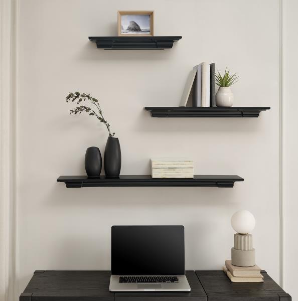 The Sadie 3 piece floating shelf set; (1)18 x6”x2”(4lbs), (1)24”x6”x2”(5lbs), and (1)36”x6”x2” (7lbs). Whether your design taste is classic, traditional, or modern, Sadie has your style covered. Available in Black and White painted finishes.