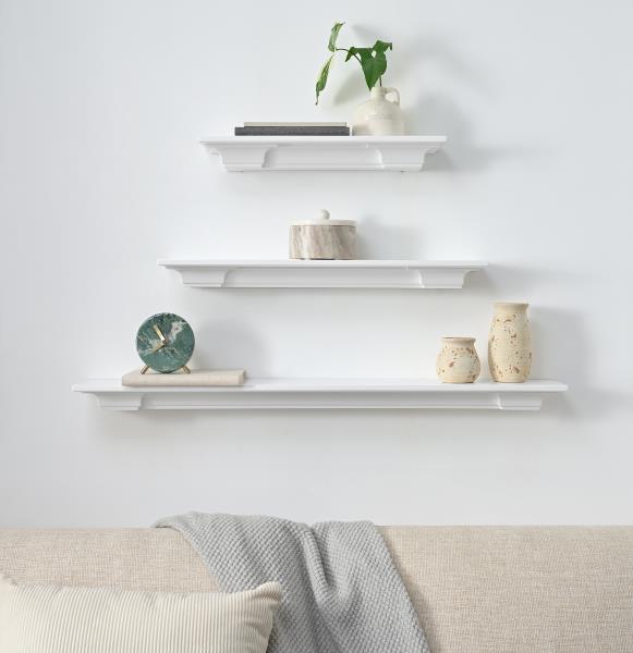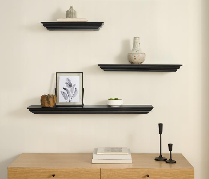 The Sunny 3 piece floating shelf set; (1)18 x6”x2”(3.5lbs), (1)24”x6”x2”(4.5lbs), and (1)36”x6”x2” (6lbs). Whether your design taste is classic, traditional, or modern, Sunny has your style covered. Available in Black and White Painted finishes.